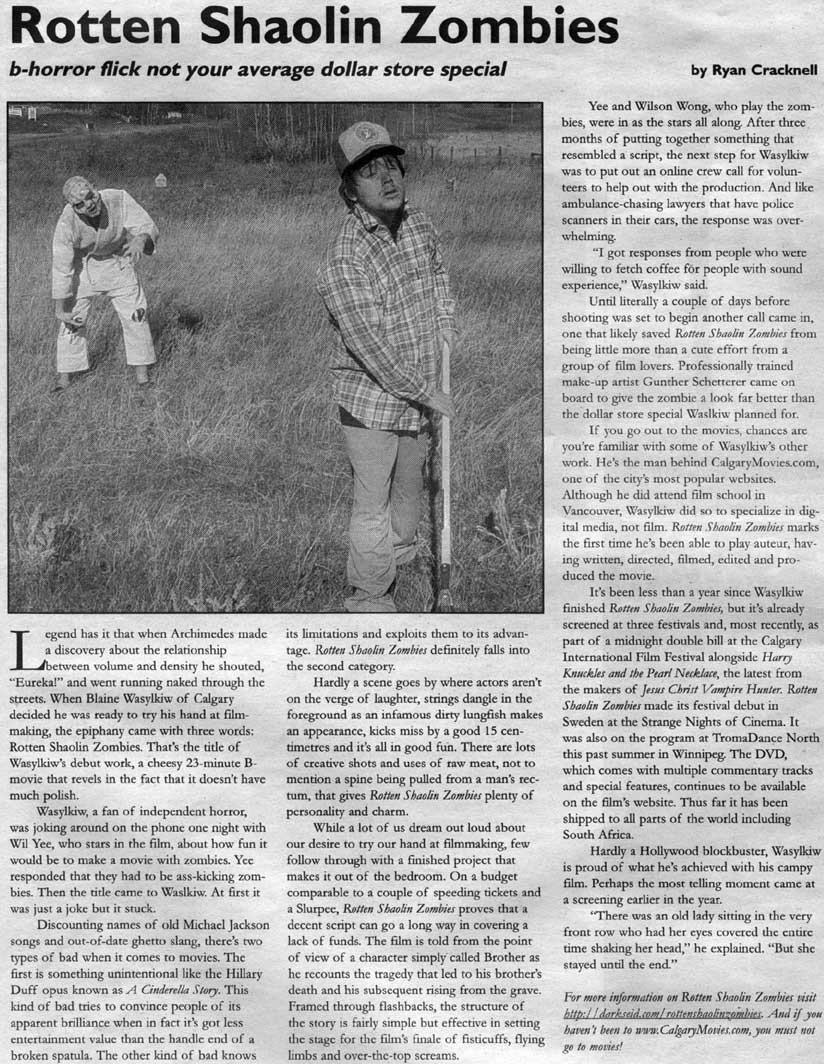 The press continues for this lil' gem of a b-movie: FFWD Weekly (Calgary arts & entertainment newspaper) did a nice little piece on the movie as did the zombie-rific AllThingsZombie.com! (3rd item)